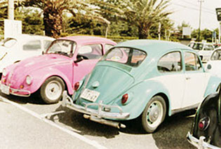 駐車場でのビートル達。ピンク色が似合うなんて、ワーゲンとポルシェぐらいではなかろうか。