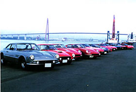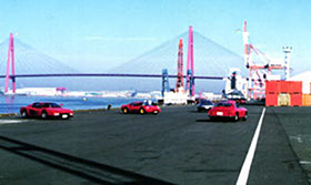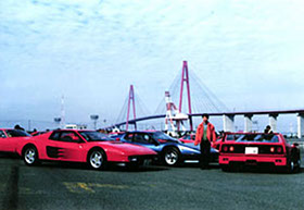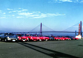 この日集まったフェラーリが、海をバックに記念撮影。後ろの橋は当時まだ、途中までの名港トリトンです。